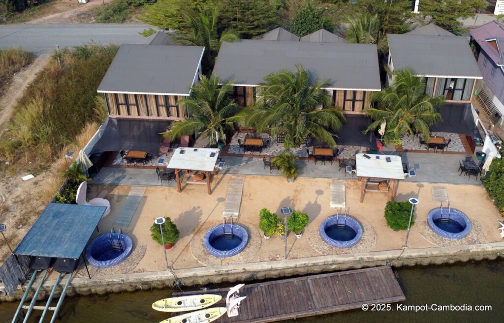 Riverfront boutique hotel in Kampot with central access and riverside stay experience.